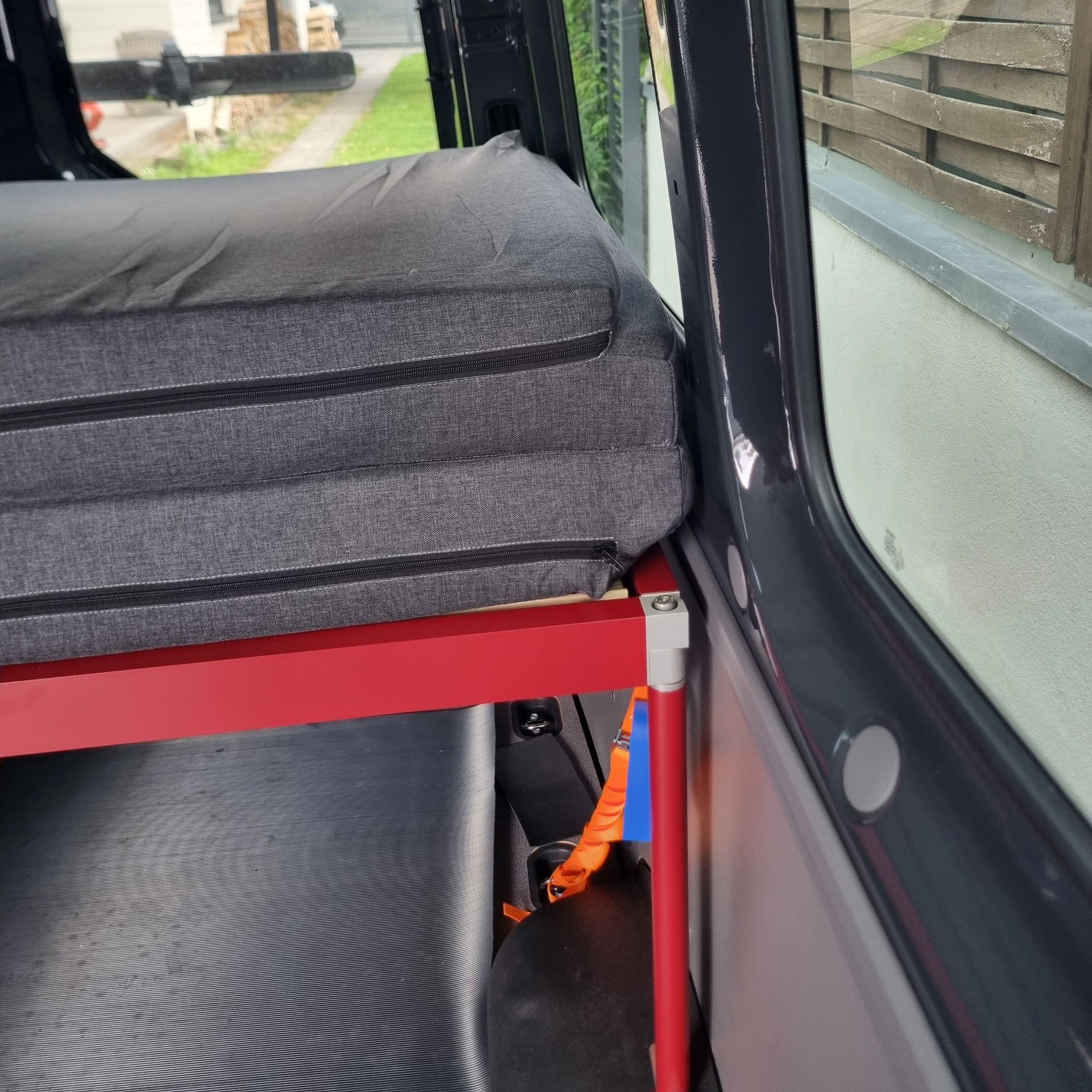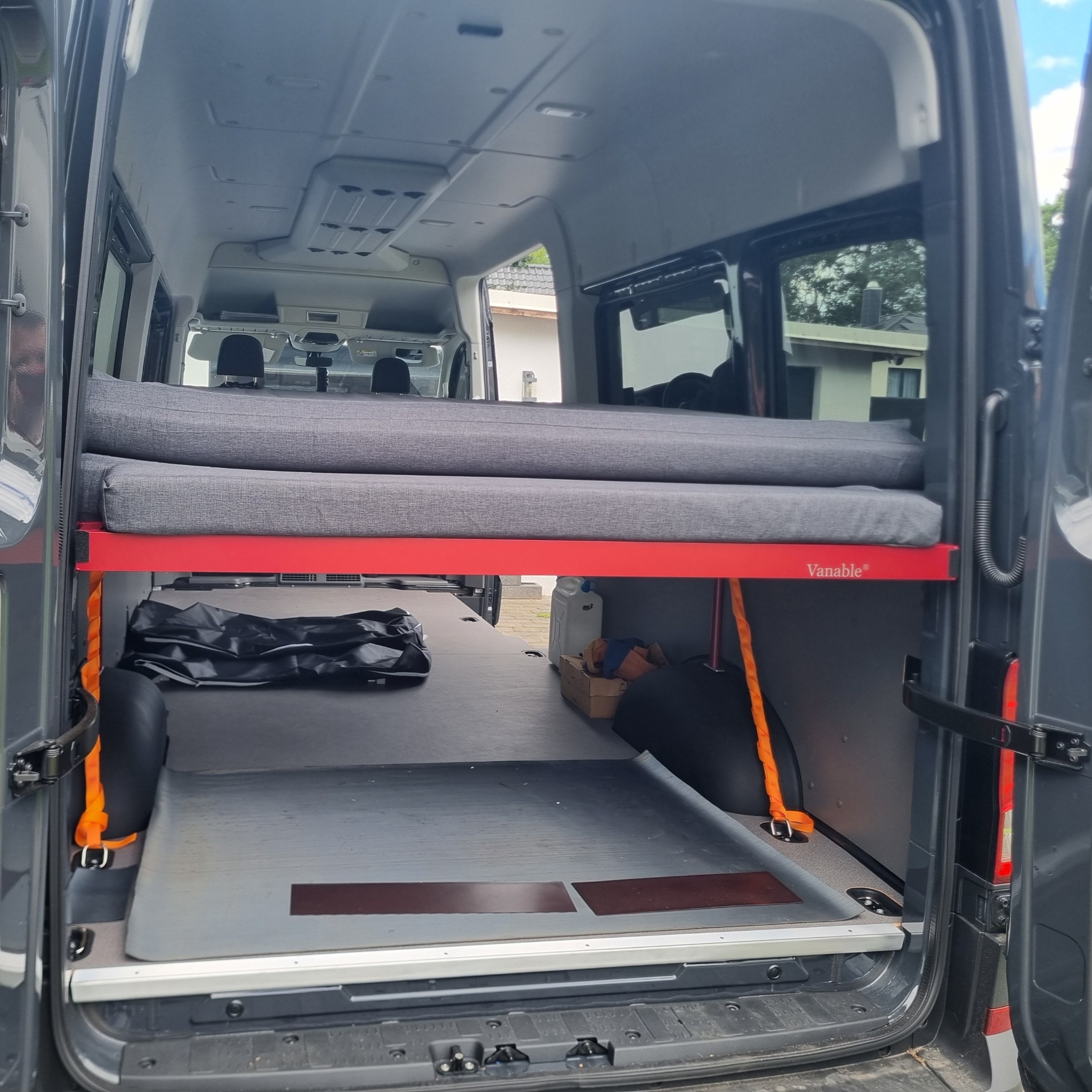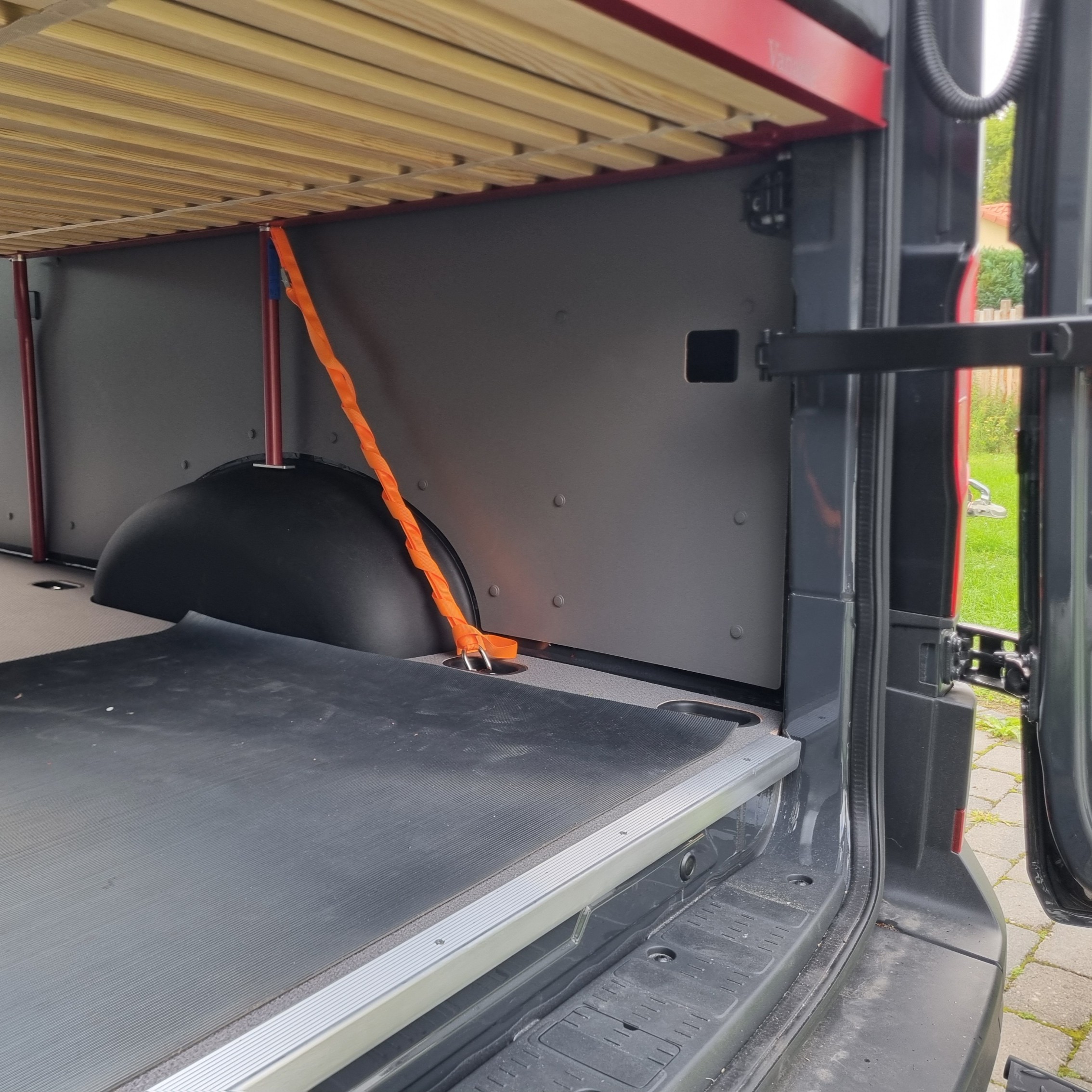 Das gezeigte Vanable ist nach Kundenwunsch gefertigt. Der Rahmen steht auf den Versteifungen für die Türanschläge der 270° Türen und mittig auf den Radhäusern. Die hintere Strebe ist nicht wie üblich gerade ausgeführt, sondern macht einen Sprung zwischen die Säulen. So wird auch dort der Platz genutzt.