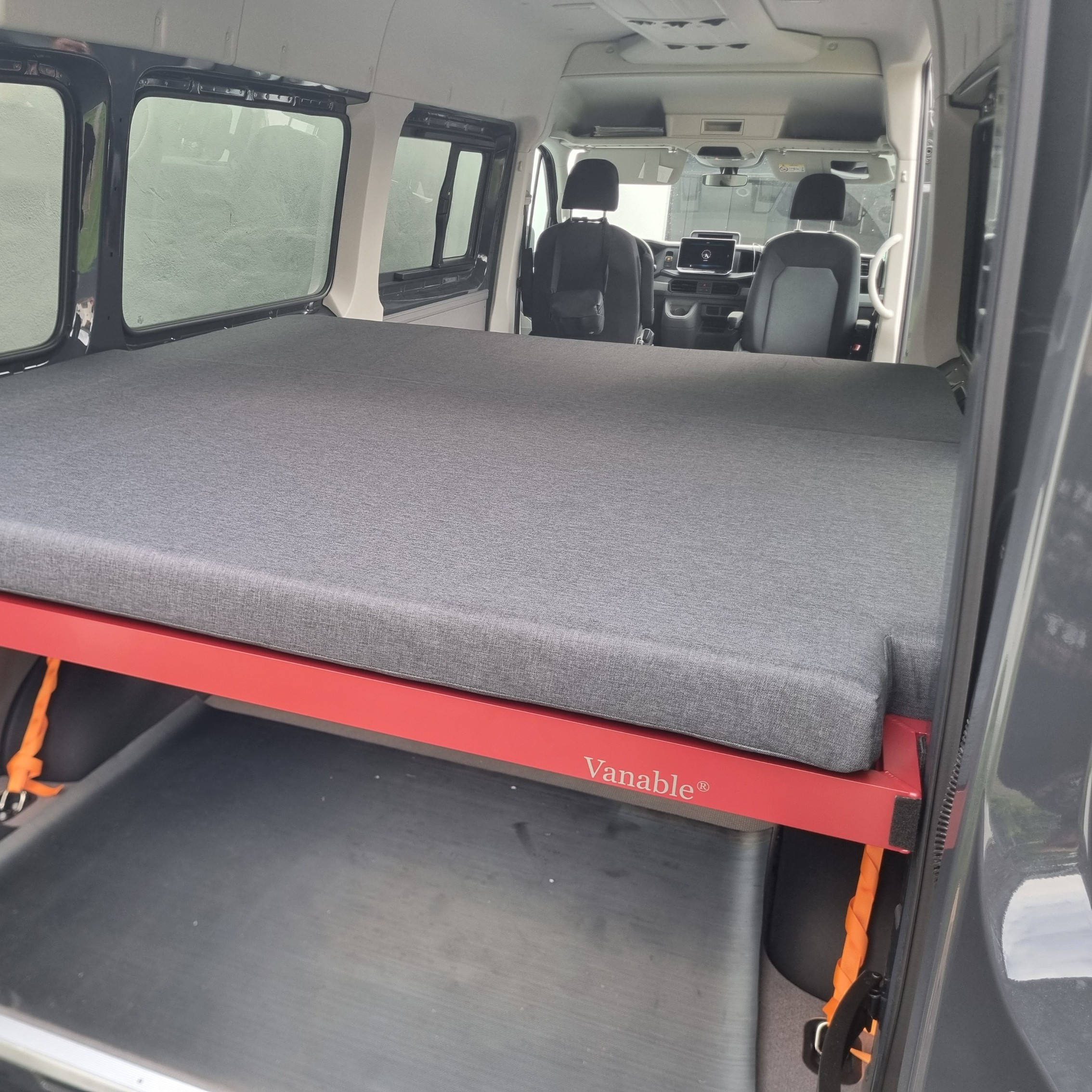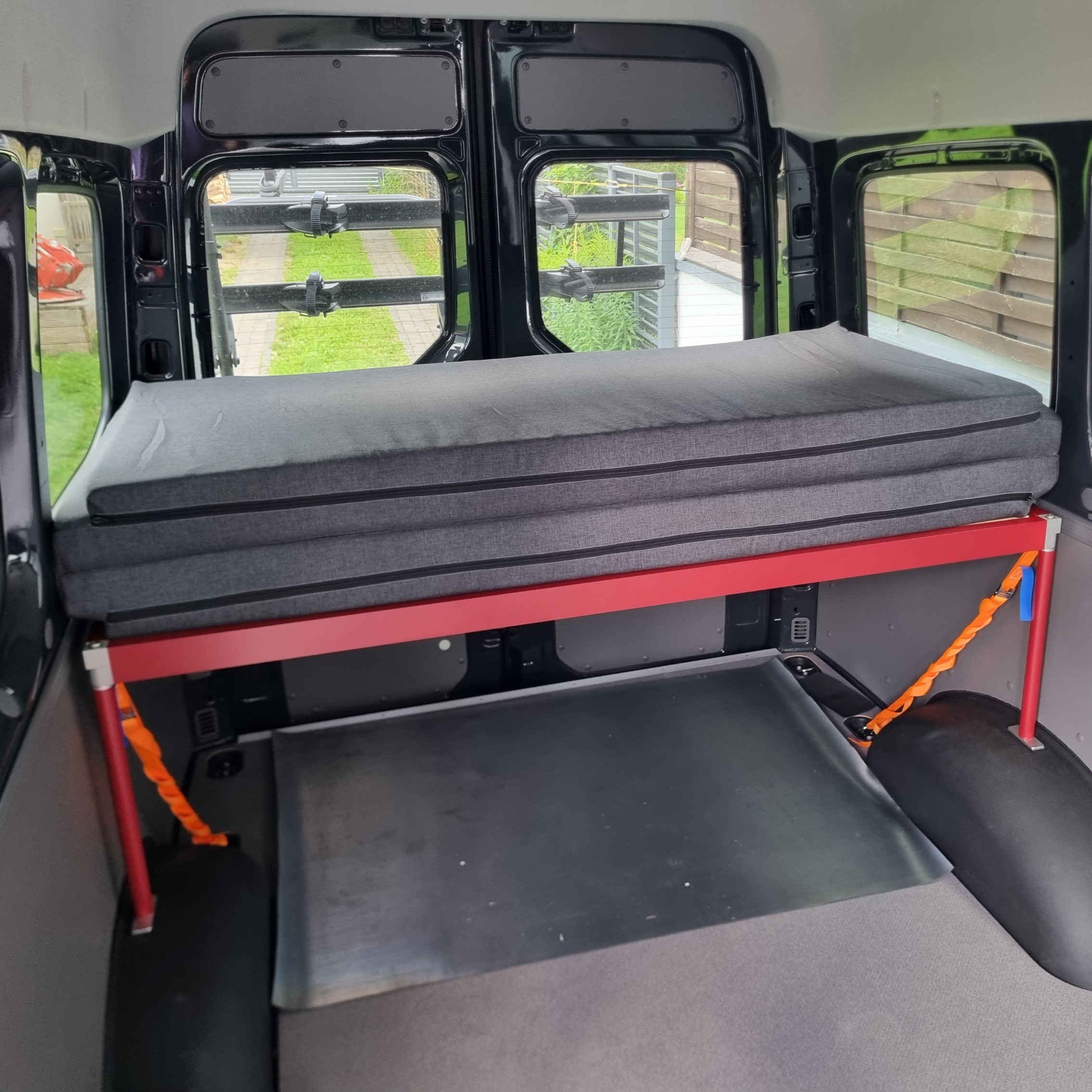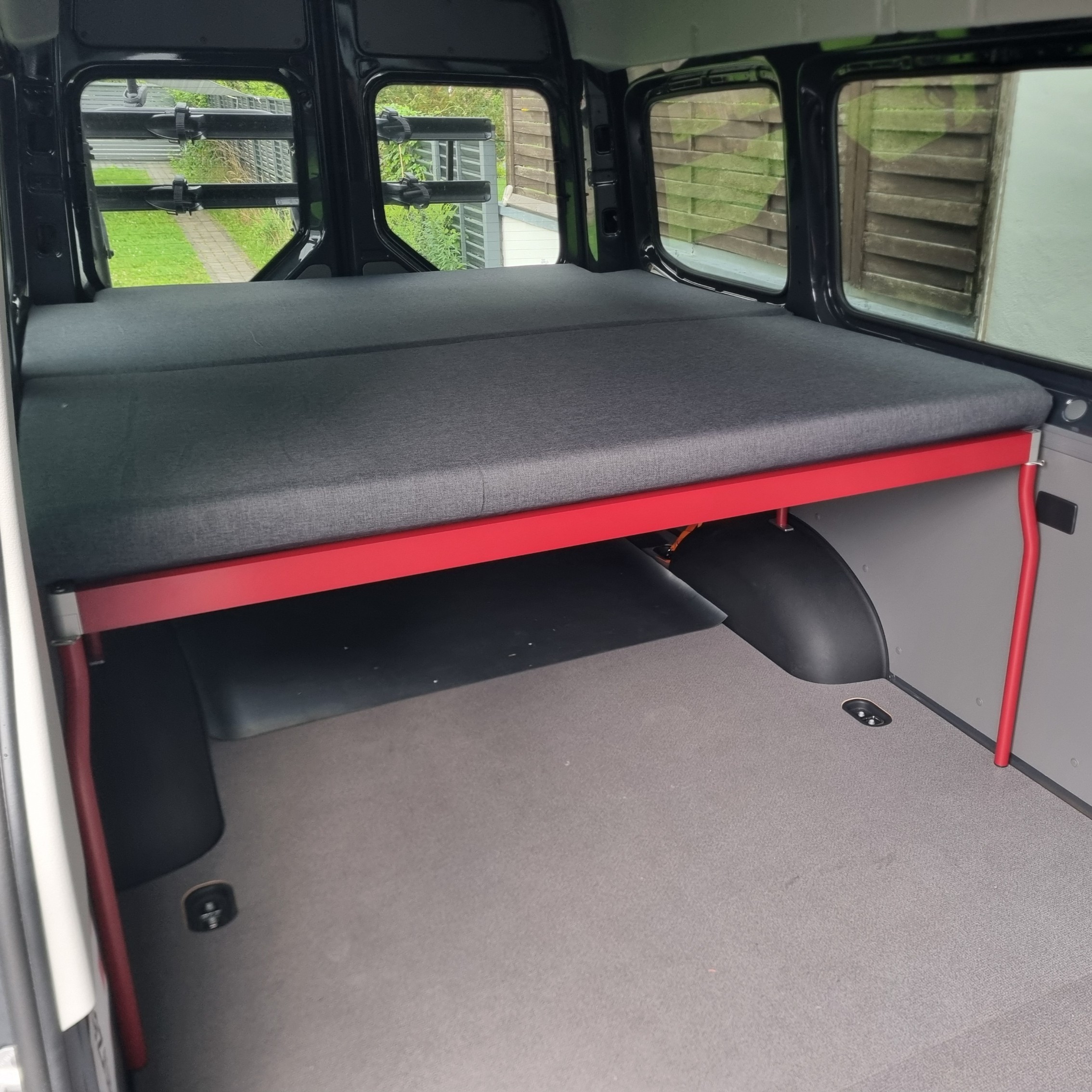 Das gezeigte Vanable ist nach Kundenwunsch gefertigt. Der Rahmen steht auf den Versteifungen für die Türanschläge der 270° Türen und mittig auf den Radhäusern. Die hintere Strebe ist nicht wie üblich gerade ausgeführt, sondern macht einen Sprung zwischen die Säulen. So wird auch dort der Platz genutzt.