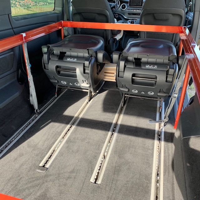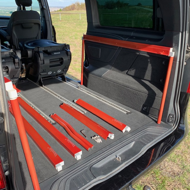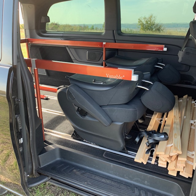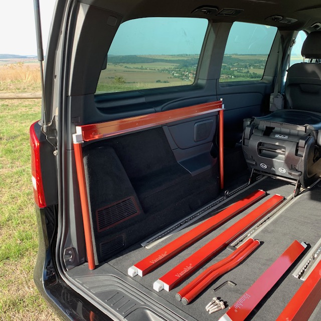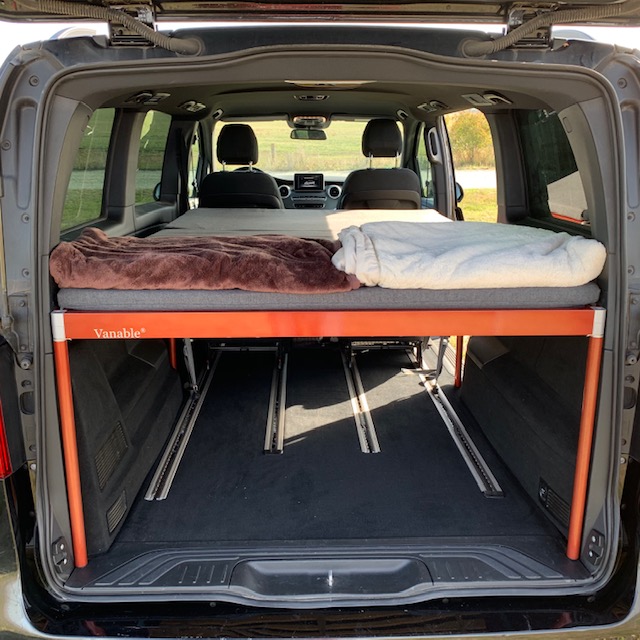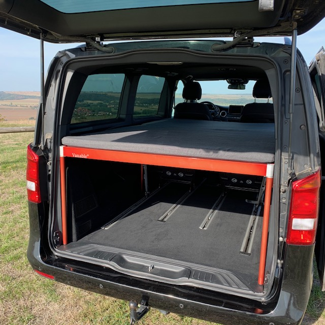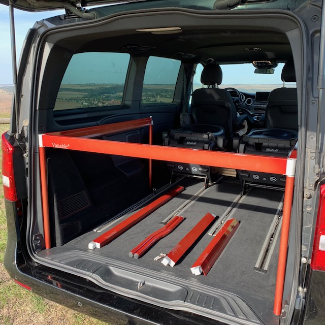 Auf den folgen Bildern beschreiben wir für Euch die Montage des VANABLE in einer V-Klasse. Für einen ersten Aufbau müsst ihr allein 20 und zu zweit 15 Minuten einplanen. Der Geübte schafft es leicht in 10 Minuten.